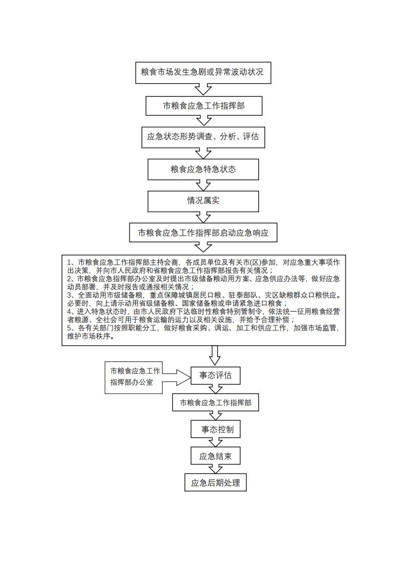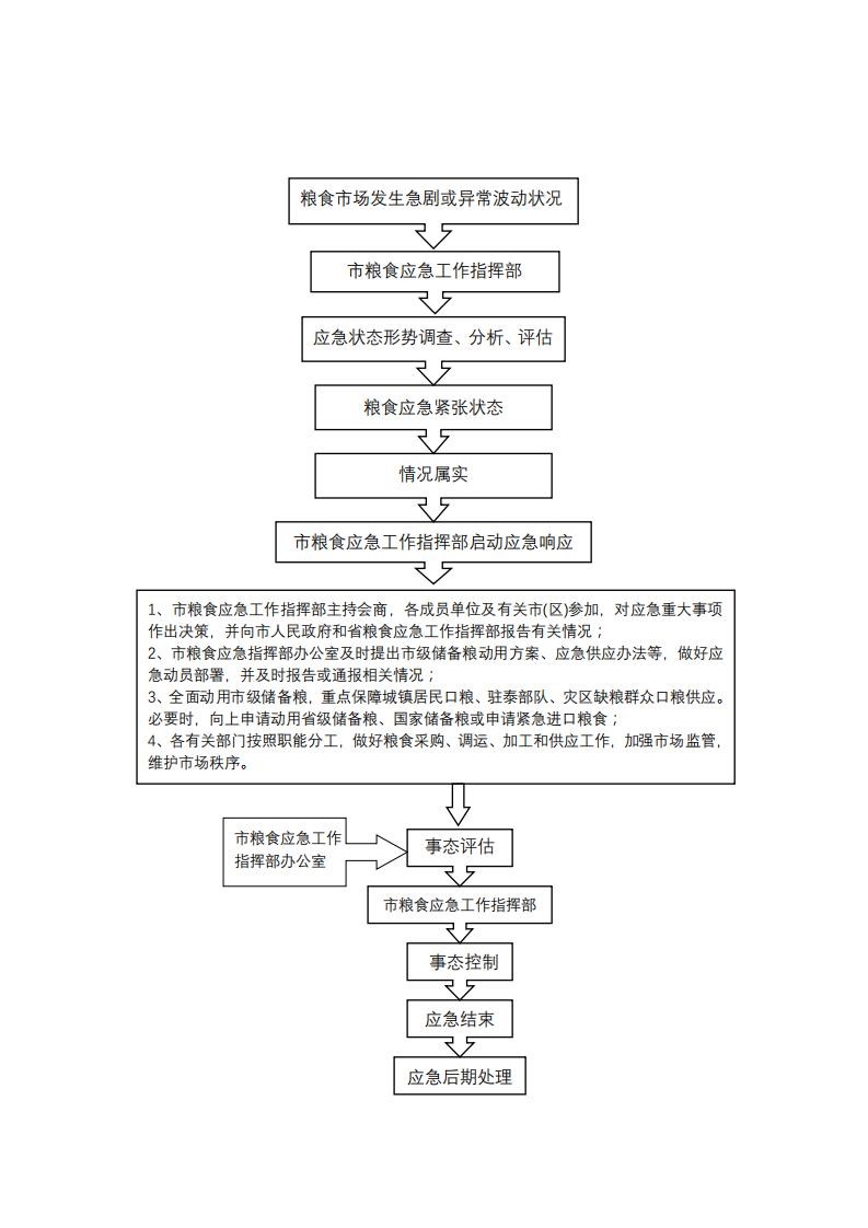 市发展改革委:负责粮食应急日常工作,做好粮食市场调控和供需形势分析;负责应急粮食的采购、加工、调运和销售供应,提出动用市级储备粮,申报动用省、国家储备粮的建议;依法做好粮食收购、储存、运输环节粮食质量安全和原粮卫生的监督管理;负责粮食市场价格的监测监管,必要时按照法定程序依法采取相关价格干预措施;负责组织跨地区电力调度协调,保证粮食加工和调运的优先需要;做好网络舆情应对。
